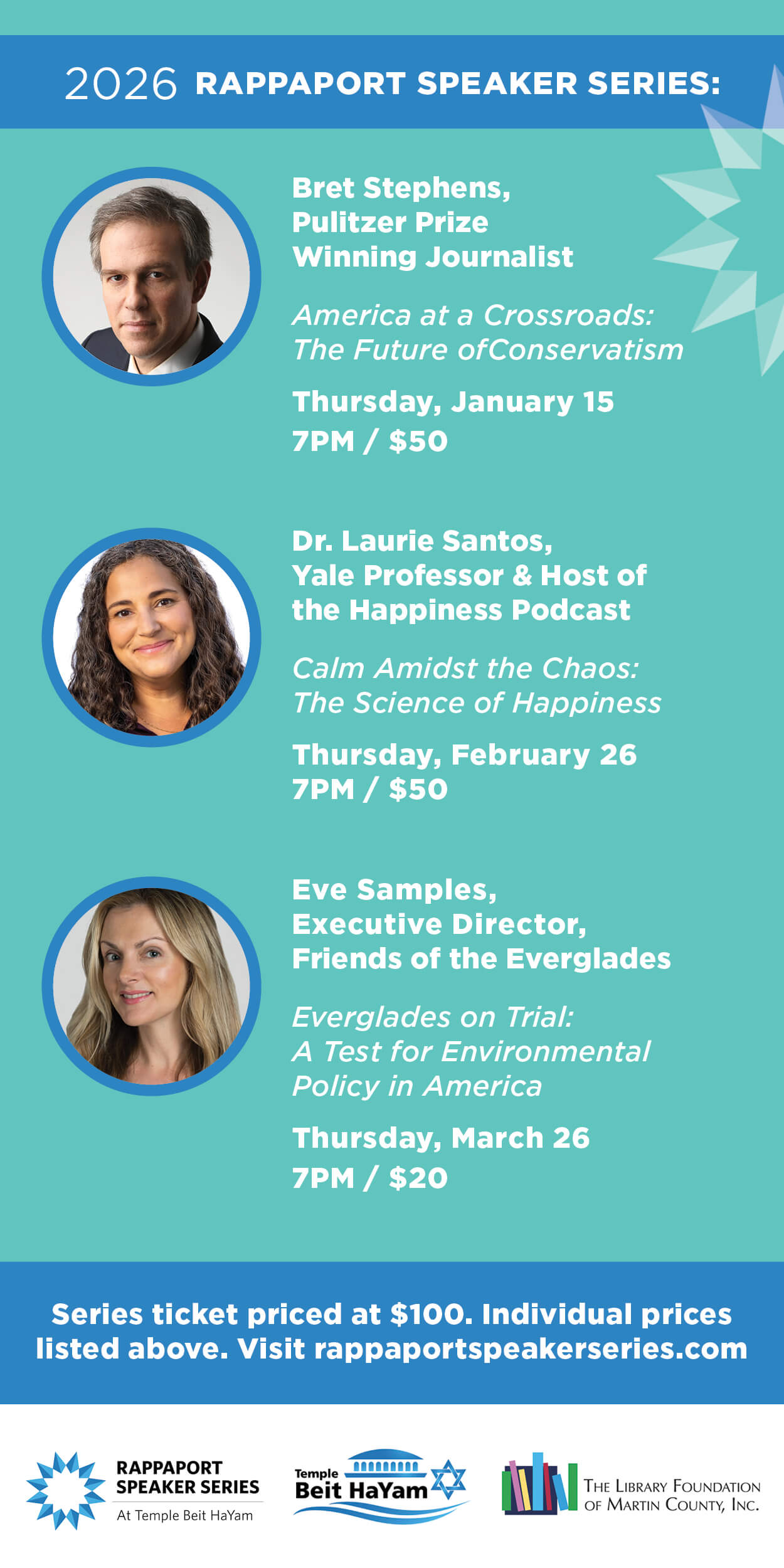 The Rappaport Speaker Series returns in 2026 with a trio of compelling thought leaders whose insights promise to challenge, inspire, and spark meaningful conversation on the Treasure Coast.